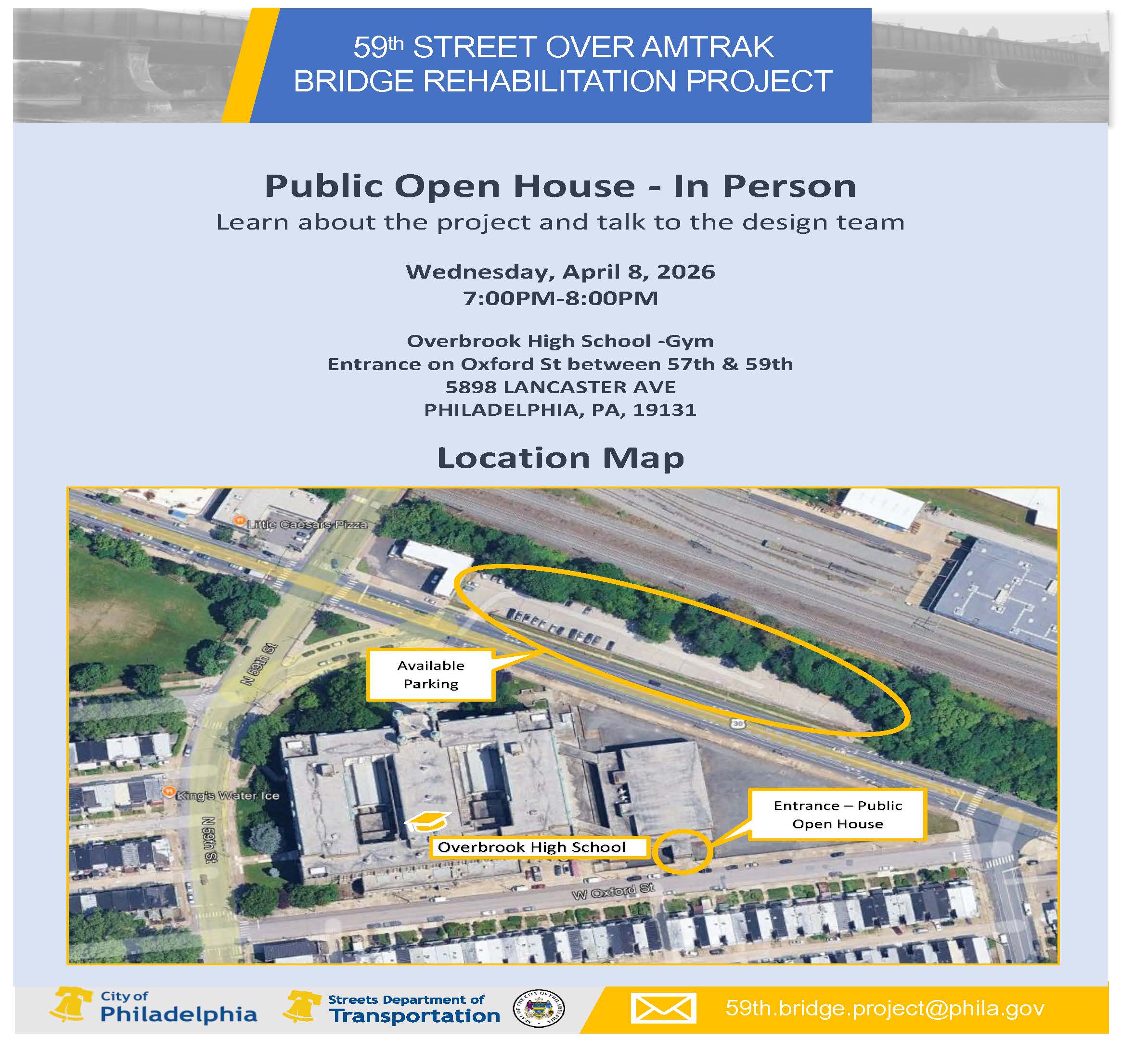 The City of Philadelphia is continuing progress on the 59th Street Bridge Rehabilitation Project, which plays a key role in connecting the Wynnefield and Overbrook neighborhoods crossing over the Amtrak and SEPTA rail lines. As it is important to engage stakeholders on both the Wynnefield and Overbrook sides of the bridge, we are hosting a community open house at Overbrook High School. As the project advances in its final design phase, we cordially invite you to our in-person Open House at the Overbrook High School Gym on Wednesday April 8, from 7:00 pm to 8:00 pm. Please see the attached flyer for more details. At the open house, you’ll have an opportunity to speak with design project team members and view materials covering: