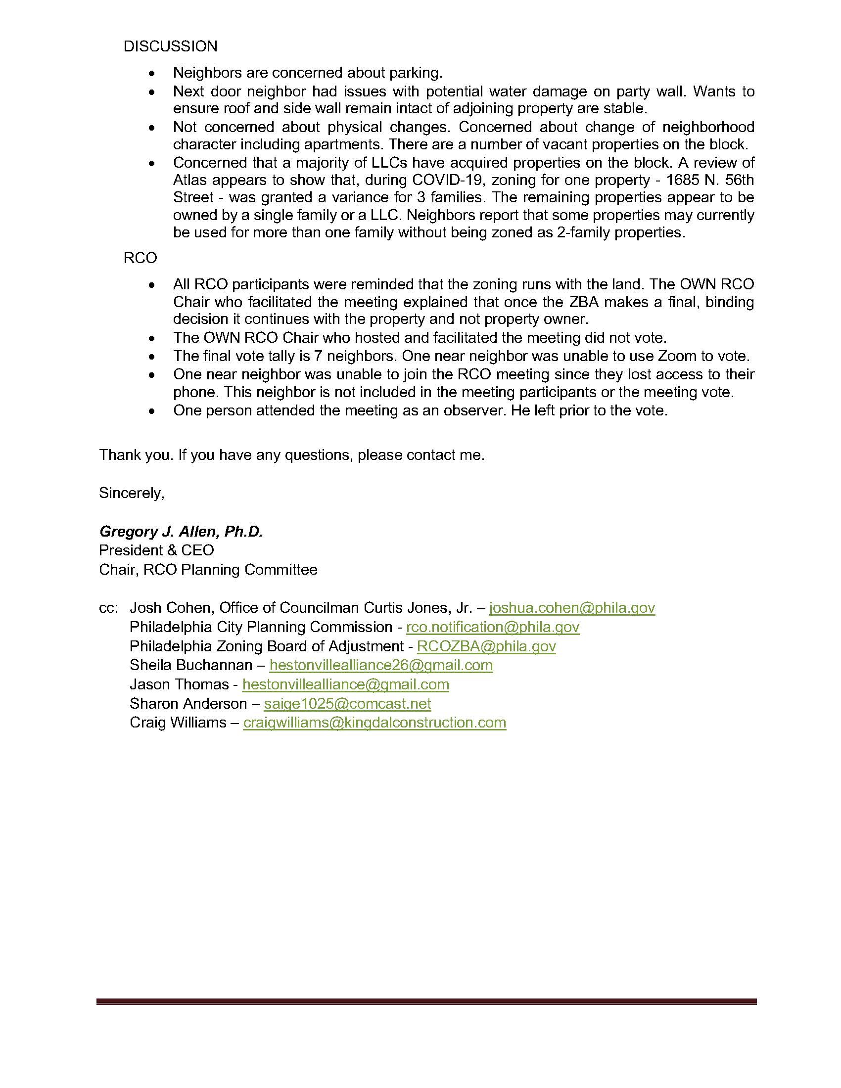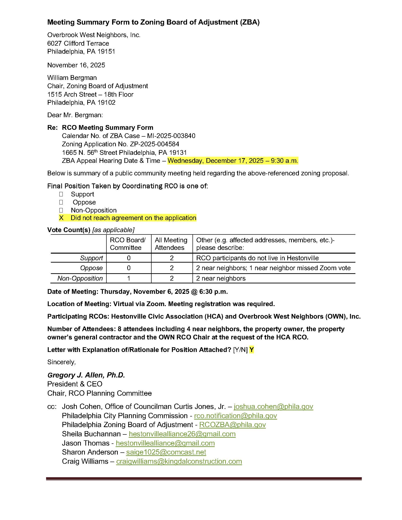 The RCO decision was evenly divided between support, oppose and neutral. The 2 opposed votes were from near neighbors.