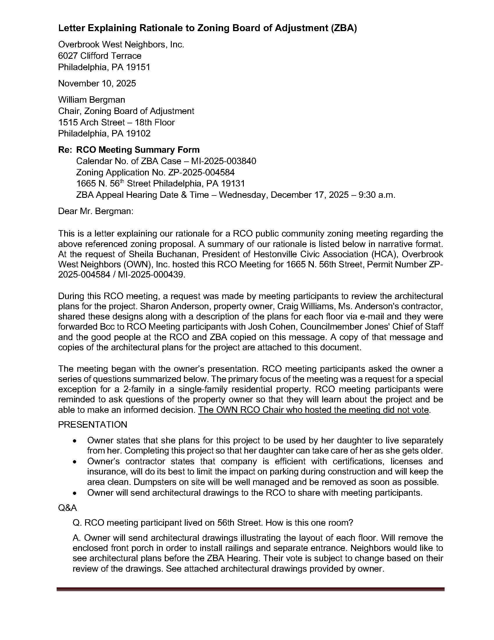 This is a ZBA Hearing for a variance. From the L&I Refusal “For the proposed use, Two-Family Household Living, within an existing structure.”